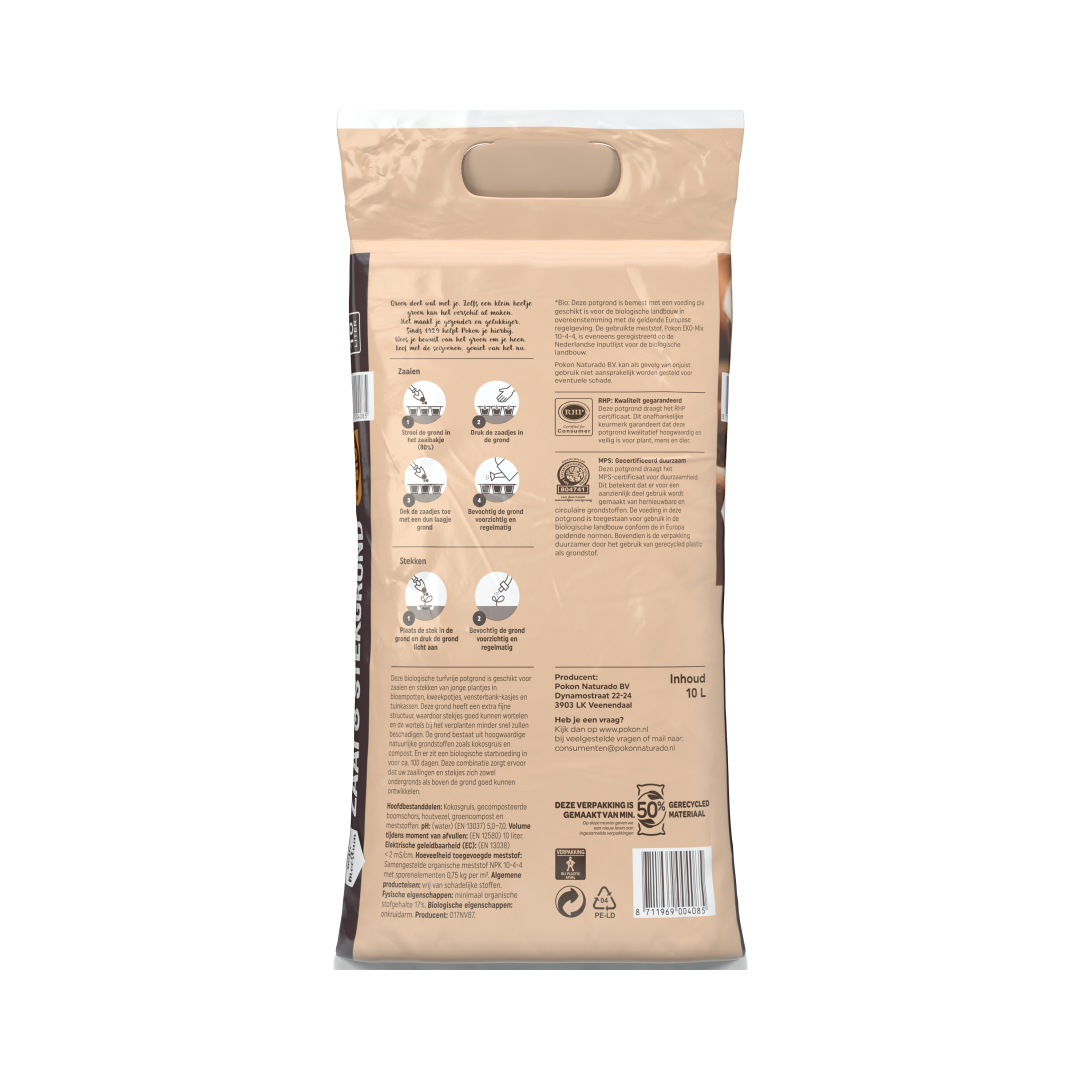 Pokon Bio Zaai & Stekgrond bestaat uit hoogwaardige natuurlijke grondstoffen, zoals kokosgruis, compost en biologische meststoffen. Om jonge plantjes zo goed mogelijk te laten groeien heeft de grond een fijne structuur en houdt de grond vocht goed vast. Bovendien bevat deze grond voeding voor 3 maanden. Dit zorgt voor een goede kieming en wortelontwikkeling. Er is een minimale kans op verbranding ten opzichte van andere potgrondsoorten.