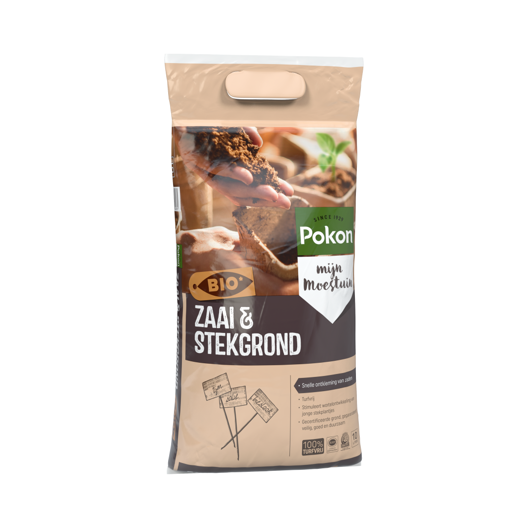 Pokon Bio Zaai & Stekgrond Turfvrij is een biologische, turfvrije potgrond geschikt voor het voorzaaien en stekken van jonge plantjes in bloempotten, kweekpotjes, vensterbankkastjes en tuinkassen. Deze grond heeft een extra fijne structuur. Hierdoor kunnen stekjes goed wortelen en beschadigen de wortels minder snel bij het verplanten. Wij adviseren om voor het stekken van sierplanten en kamerplanten gebruik te maken van Pokon Stekpoeder. In deze potgrond zitten bovendien biologische meststoffen die voor 100 dagen voeding geven. Met Pokon Bio Zaai & Stekgrond ontwikkelen zaailingen en stekjes zich goed, zowel boven- als ondergronds.