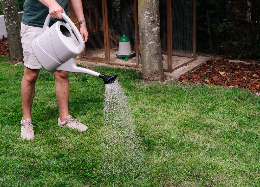 - Giet de oplossing in een gieter en voeg de benodigde liters water toe. Gebruik 1 liter water per vierkante meter. Als je meerdere gieters nodig hebt, verdeel de oplossing dan gelijkmatig.