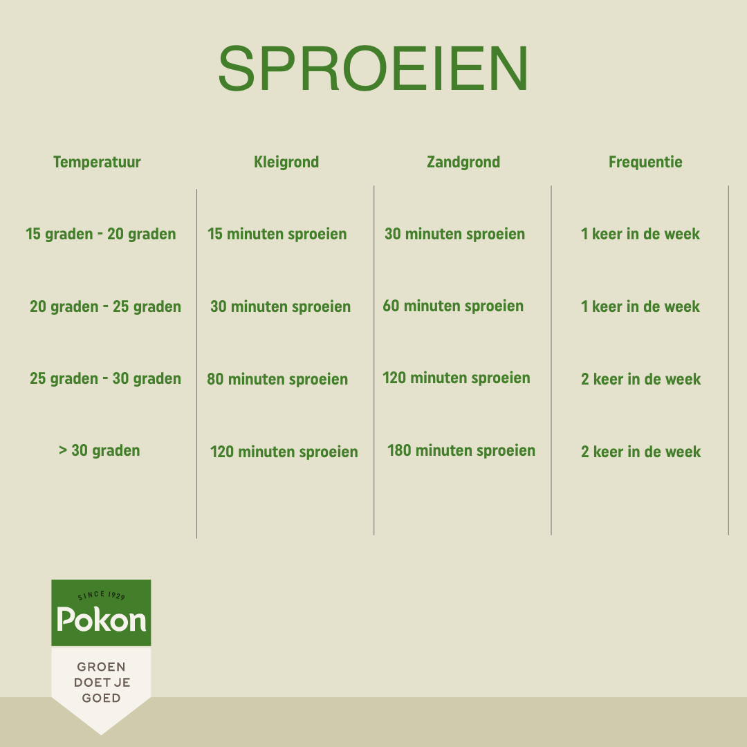 Over het algemeen is het sproeien van je gazon pas nodig wanneer de temperatuur boven de 15 graden Celsius uitkomt. Het is belangrijk om rekening te houden met de grondsoort van je gazon bij het bepalen van de juiste hoeveelheid water. Kleigrond houdt namelijk meer vocht vast dan zandgrond, waardoor je bij kleigrond minder lang hoeft te sproeien. Wanneer je jouw grond kan kneden tot de dikte van een potlood, beschik je over kleigrond.
