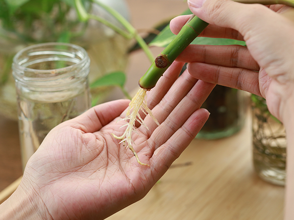 Je kunt je planten op verschillende manieren laten wortelen. De makkelijkste manier voor de meeste stekjes is om ze een tijdje in het water te “hangen”. Hierdoor kan je het stekje goed in de gaten houden en je hoeft niet bang te zijn dat je te weinig water geeft. De nieuwe wortels die gaan groeien vullen je glazen vaasjes of potjes! Een nadeel van deze methode is dat de stekjes daarna erg moeten wennen aan hun nieuwe “zanderige” omgeving, met de wortels in de potgrond. Het is daarom ook raadzaam om de grond licht vochtig te houden, totdat je ziet dat de plant goed geaard is.