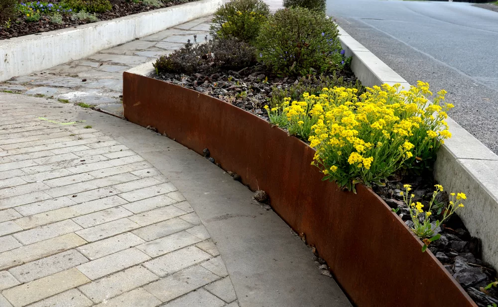 De roestbruine kleur van cortenstaal borderranden valt mooi samen met de natuurlijke tinten van de tuin. Het is één van de populairste borderranden van het moment en geliefd in een moderne tuin. Hierdoor wordt het een geheel met de border. De stalen rand wordt in delen of op rol geleverd. Onderaan zitten stalen punten waarmee ze in de geul geplaatst worden. Vul daarna de geul op, zodat de rand stevig staat.