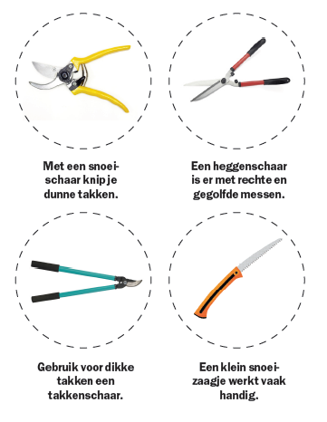 Als een tak in de weg zit of de boom opgekroond moet worden, moet je weleens een dikke tak weghalen. Zaag daarbij altijd net buiten de takkraag, de verdikking bij de overgang van stam naar tak. Als de takkraag intact blijft, kan een boom zijn wonden sneller afgrendelen en overgroeien. Bij het afzagen kan een tak soms plotseling doorbreken, waarbij er vaak ook een reep bast van de stam afscheurt. Omdat dit een invalspoort voor ziekten is, smeer je in dat geval een wondafdekmiddel op de plek. Het inscheuren van de bast kun je voorkomen door dikke takken in drie etappes af te zagen.